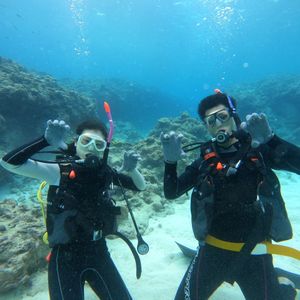 ダイビング初心者でしたがスタッフさんの指導のもと安心して楽しくダイビングすることができました(^^)大雨の次の日だったせいかちょっと濁っていましたがそれでもキレイな海で感動しました!!カメには会えなかったけどサメに会うことができました♪泳いでる魚の説明してくれたりもしてくれました!船の中では飲み物もあり、ランチのお弁当もおいしかったです(^^)新婚旅行で沖縄に来たという話をしたら最後に写真をプレゼントしてくれました!うれしかったです!!また遊びに行きます♩