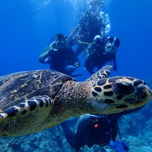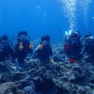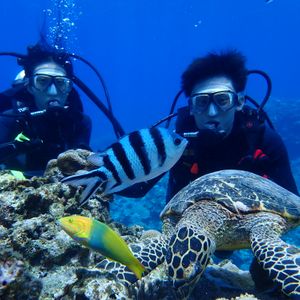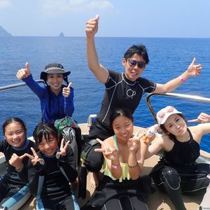 10/17に家族5人で参加しました。体験ダイビングは1人のインストラクターに2名までしか引率できないのですが、3人のインストラクターで2名+2名+1名を引率してしただき、家族5人の集合写真を撮影していただき、とても良い思い出となりました。インストラクターの方はとても親切で、不安のあったダイビングも5人全員楽しめました。慶良間の海はとても綺麗でしたが、想像していたよりはお魚の数が少なかったこと、ウミガメには出会えなかったことが少し残念でした。乗船後に格安でのパラセーリングのオプションも用意されており、思いがけずのパラセーリング体験もでき、沖縄での1日をとても有意義に過ごすことができました。