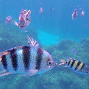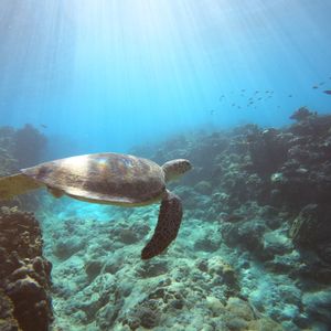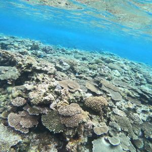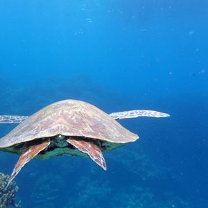 青く透き通った海でウミガメを間近で観察したり、大きなロウニンアジも見ることができて