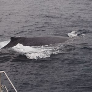 そこからは、スピードを緩めた船の前の方に皆で集まり、クジラが海面に浮上してくるのを今か今かと待ちわびました。最初の潮吹きを見かけてからものの5分もしないうちに、クジラが姿を現しました。