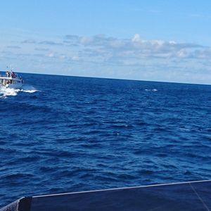 参加の方も多く2隻に分かれて出発です。1つめのポイントまで景色を楽しめます。船から見る島々、美ら海水族館などとっても良い眺めで、スタッフの方がユーモアを添えガイドして下さいます。そして、いよいよ1つめのポイントに到着!周りには、他のウオッチングの船や美ら海水族館の調査船も待機です。あれほど集中して海を眺めたのは初めてです(笑)すると、シュッーーっという音とともに潮が吹き上がり尾びれが見えました!一斉に船が鯨の方向にスタートします!10分、15分おいて2度ほど尾びれを見ることができましたが、少し物足りなさを感じていたところ2つ目のポイントにダッシュ!!到着すると鯨がすぐ目の前に!!!大大サービス?!!人懐っこい鯨でパフォーマンスを繰り広げてくれます!