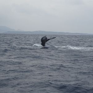 母との沖縄旅行の中でホエールウォッチング by 沖縄アイランドクルーに参加しました。午後からの参加でしたので午前中にちゅら海水族館を満喫し、港まで移動。水族館からは車で20分程度ですが、駐車場から出るのに手間取り少し遅刻して、ご迷惑をおかけしてしまいましたが、連絡をすると、スタッフの方が落ち着いて誘導していただきとても助かりました。当日の天気は晴れ時々曇り、気温は18度くらい、ヒートテックにフリースのパーカーその上に配布されたカッパを着込んで出発、寒くはありませんでした。インターナショナルな参加者は30名くらい?!二船に分かれて本部港から乗船しました。レーダーは使わず、目で探すとのこと。二船は左右に二手に別れ、私たちは右手にひた走ります。20分くらい、途中波の荒いところもあり、気分が悪くなった方もいました。私はご飯を軽く食べて、乗船の30分くらい前に酔い止めを飲んでいたおかげか、まったく大丈夫でした。途中左手にすすんだもう一艇の船から「鯨発見」の連絡が入ったようです。急いでその船を目指します。到着すると、その辺りには既に四艇の船が漂い、塩吹きを待ちます。遠くに霧のような塩吹きがあがった途端、五艇はいっせいにその地点を目指します。くるっと囲むようにして停泊し、息を凝らして彼らを待ちます。すると黒い背中が丸く見え海に沈み、しばらくすると、もう一回背中が見えてきて、最後にぴよっと尾っぽが立ち上がり、また水中に消えていきます。かなり近いです。ハワイでもホエールウォッチングは参加しましたが大きな船でしたので100メートル以内に近づくことはできない規則があるんだとか・・・何度も鯨はあがってきて私たちを楽しませてくれました。時には二頭一緒にあがってきたりして、とても迫力がありました。母がスタッフの方に「鯨も追い掛け回されて大変だね。」なんて言っていましたが「鯨も楽しんで遊んでいるんじゃないですか。」なんて茶目っ気たっぷりのコメント。塩吹きがあがった途端に我先にと船を走らせる船長さん。少年のような心でお客さんを楽しませようとする心意気を感じました。とても楽しかったです、ありがとうございました。