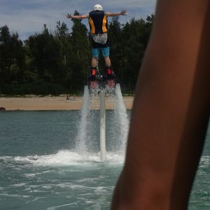 インストラクターのお兄さんからフライボードの説明や立ち方、注意事項などを聞いたのち、足のつくところでブーツを履き、まずはうつぶせになる練習です。そして、立つ練習をしたら、ジェットスキーで沖に引っ張られていざ本番。