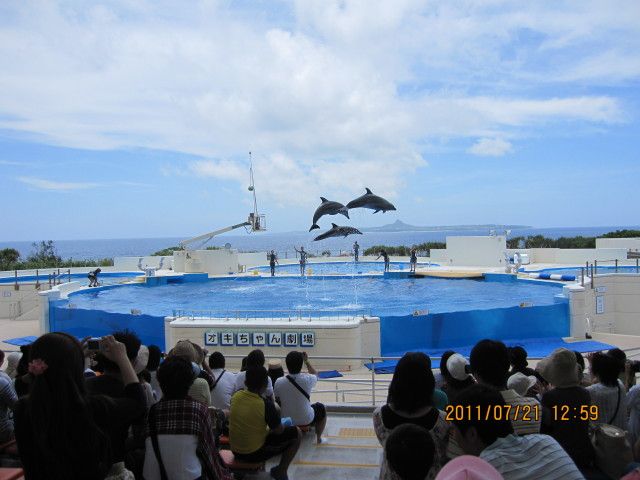 美ら海水族館も2時間30分の時間で十分楽しめました。ランチは各自で済ませることになっており、10分ほど待ちましたが、念願の水槽が眺められるカフェ『オーシャンブルー』で食べることもできました♪ゆっくり泳ぐ魚たちはずーっと見ていてもホント飽きません。その後オキちゃん劇場でのイルカショーも見て、大満足でした♪