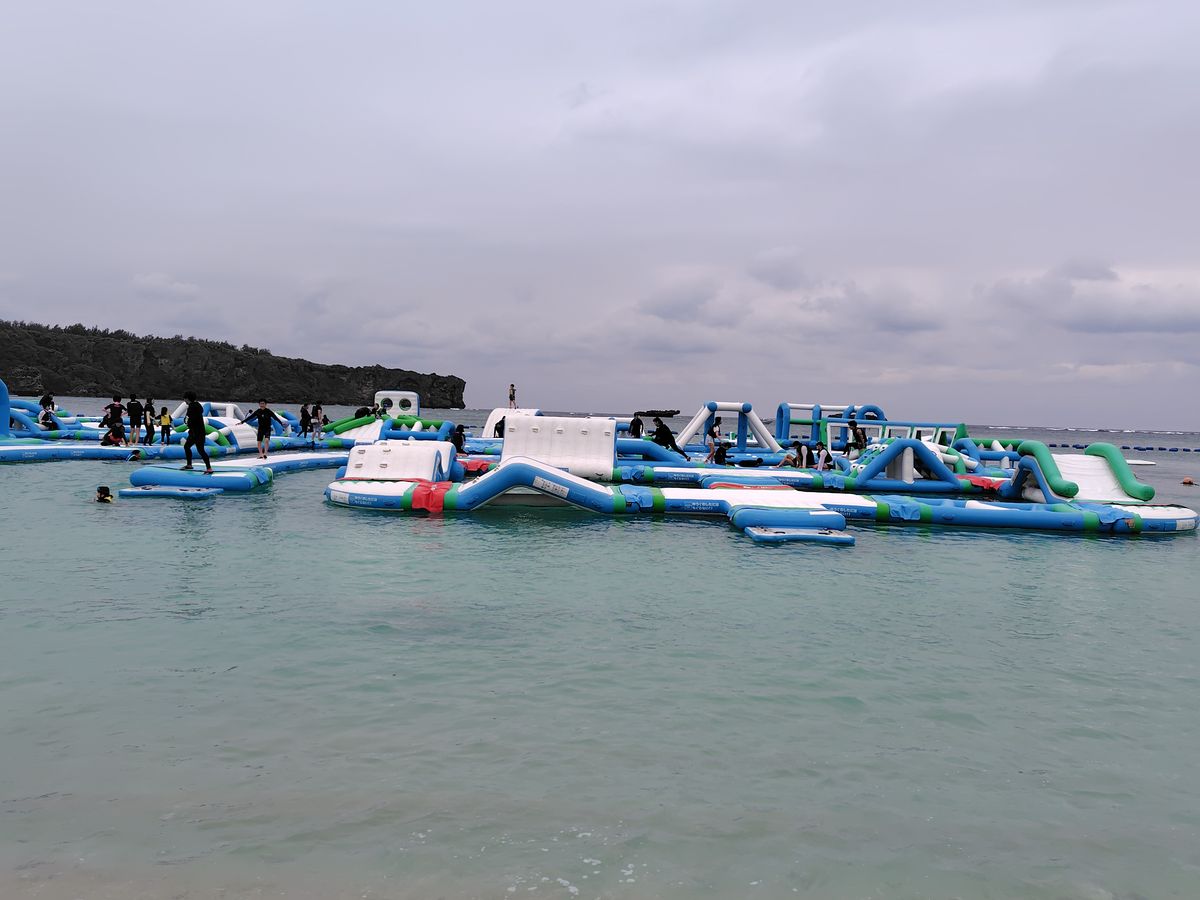 アスレチックにたどりつくまでに海の中に入らないといけないので、最初から修行のような感じでしたが、フロートに上がると子供はテンション上がり走り回っていました。