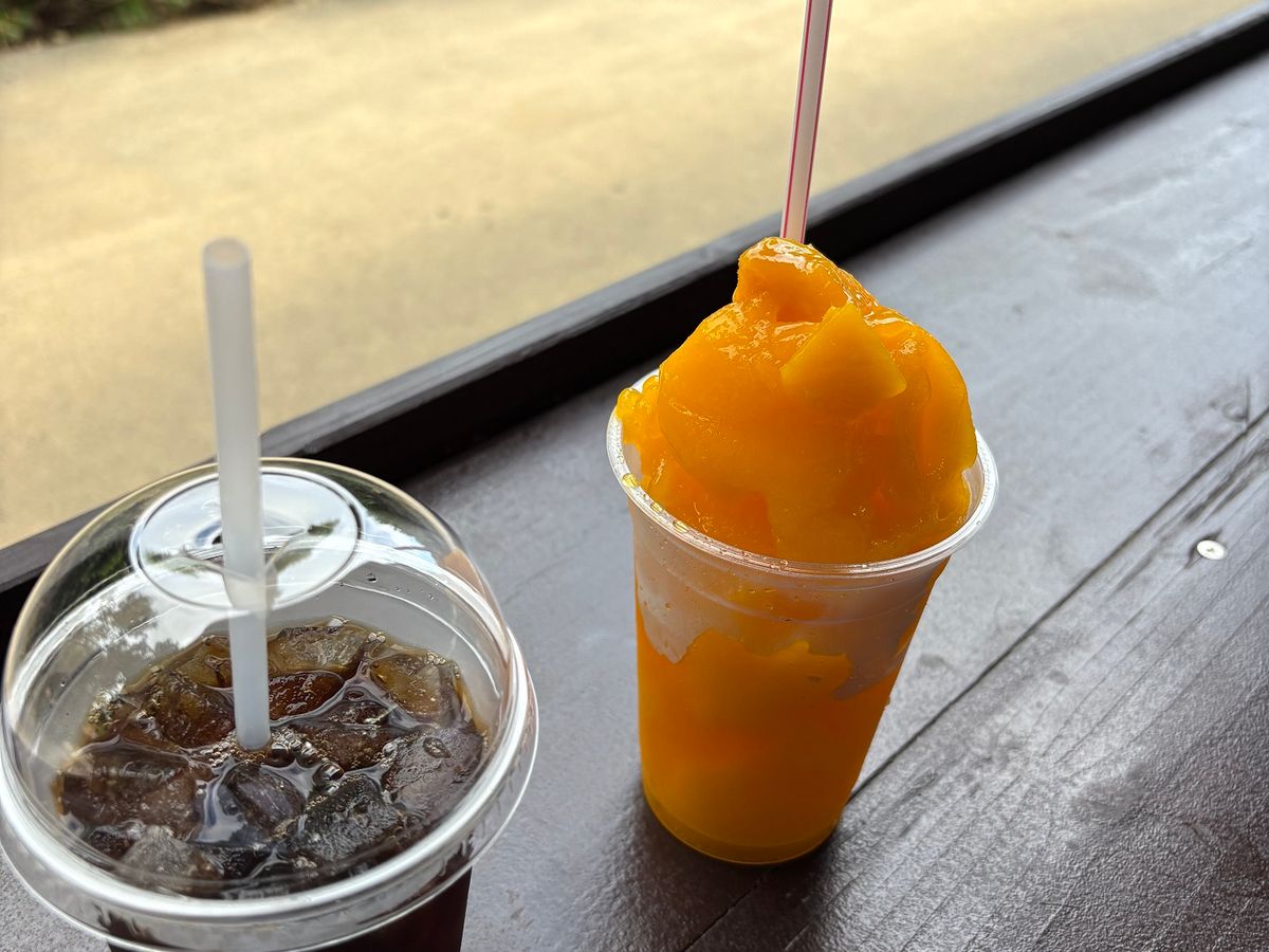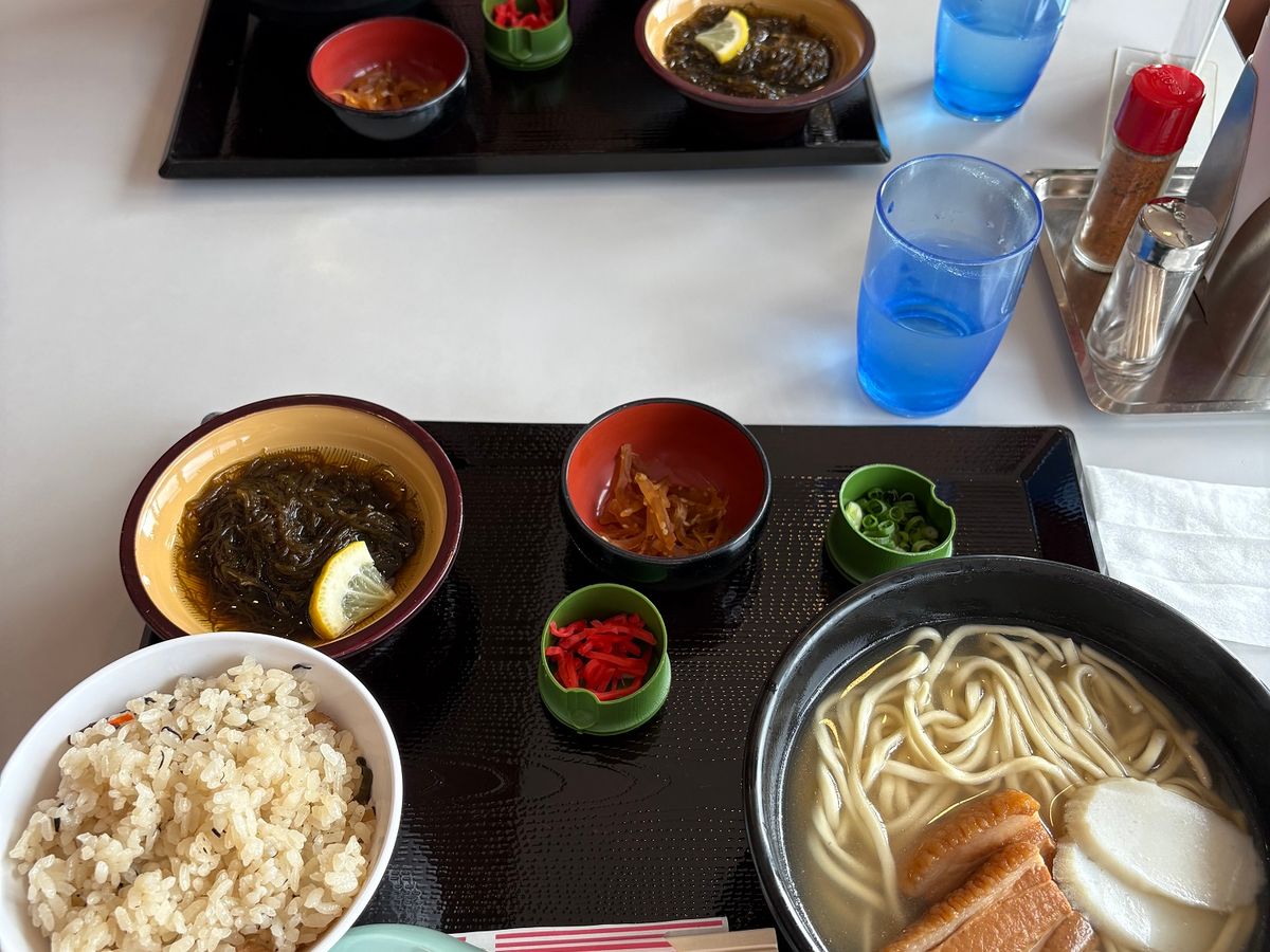 昼食は写真の「沖縄そば定食」を注文しましたが、沖縄そば、もずく酢、名前を忘れましたが炊き込みご飯のようなものがついて990円は安いと思いました!あと、洞窟を出た後の写真のドリンクは、アイスコーヒー300円、マンゴースムージー700円やはり安く感じました!お土産売り場も含め、とても楽しく、気づくと5時間以上滞在していた感じです!
