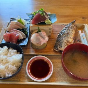最北端を目指すワクワク感と、青い海が見下ろせる開けた場所に、こじんまりとした味のある食堂で、新鮮なお刺身と肉厚の白身魚のフライをいただきました。