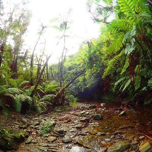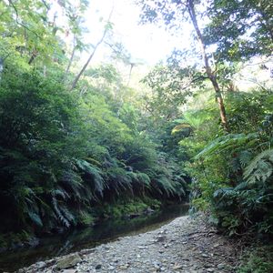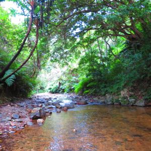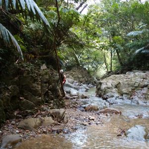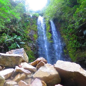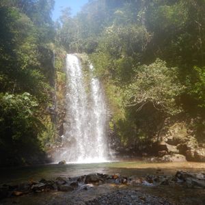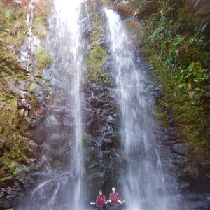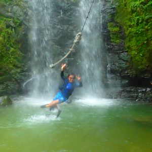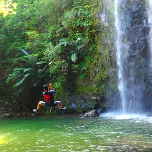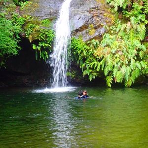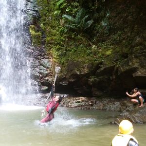 駐車場らしいところもなく、道端の広いスペースに車を留めて川のぼり開始です。うっそうと生い茂った森のせいで晴れの昼下がりでも薄暗い川の中を進みます。マイナスイオン小鳥のさえずりや珍しい植物の説明を聞きながら、川の中を泳いだり岩に上ったりぶら下がっている蔦で遊んだりしながら進んでいくと、いきなり目の前が広がったと思ったら、そこには見事な滝がありました。