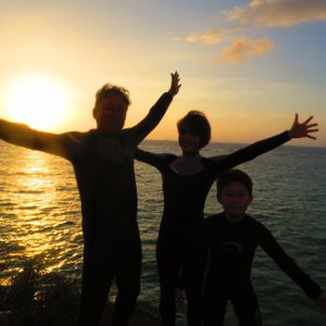 シュノーケルの経験はありましたが、夜は初めてでドキドキでしたが、天候にも恵まれ、夕日の沈む頃に家族で記念写真!