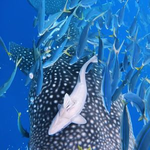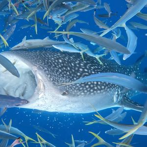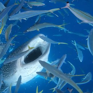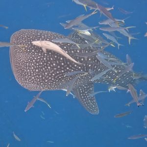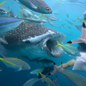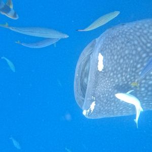 ボートから海に入るとすぐに手が届きそうな近さにジンベイザメが2匹泳いで来ました。 自分のカメラではレンズに頭しか収まらない大きさでした。 シュノーケリングでも十分に餌を食べる様子を観察することができました。 動画や写真もたくさん撮って頂きました。