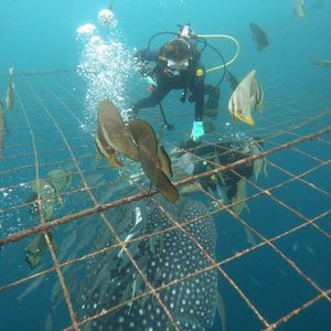 ライセンスなしの人は網の上からジンベイザメを眺める事になりますが餌付けしてくれて、近くまで来るようにしてくれているので間近で見れますし、何より網の上にいるだけでいいので安心かと。