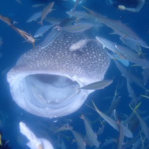 まず、他のダイビングショップのお客さんとの乗り合いですが、港で船に乗り、ジンベエザメの待つ沖合へと向かいます。シュノーケリングの時間は、ちょうど私たちが上から見やすいところに浮上してきてくれるジンベエザメのお食事タイムに合わせてくださっています。ですので、間近で大きな口や、大きな体を眺めることができます!夢中になって、ついもっと潜りたくなってしまいました。