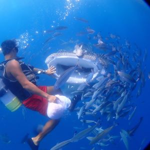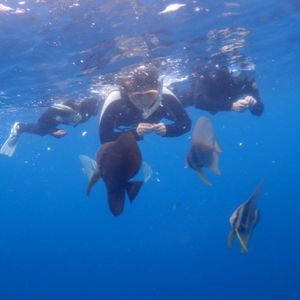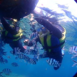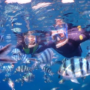 シュノーケリングでジンベイザメと泳げるなんて...半信半疑で集合場所にいきました。それが船から海に入ると、本当にジンベイザメが目の前に...感動的でした。まったく危険もないので安心です。絶対お薦めです!!!