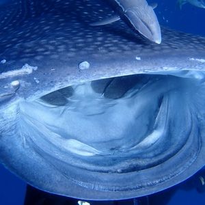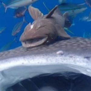 目の前を優雅に泳ぐジンベイザメとコバンザメたち。