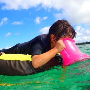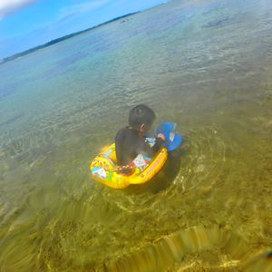 まだ海に慣れていない子には、ぷかぷか浮かべる浮き輪がもってこいです!