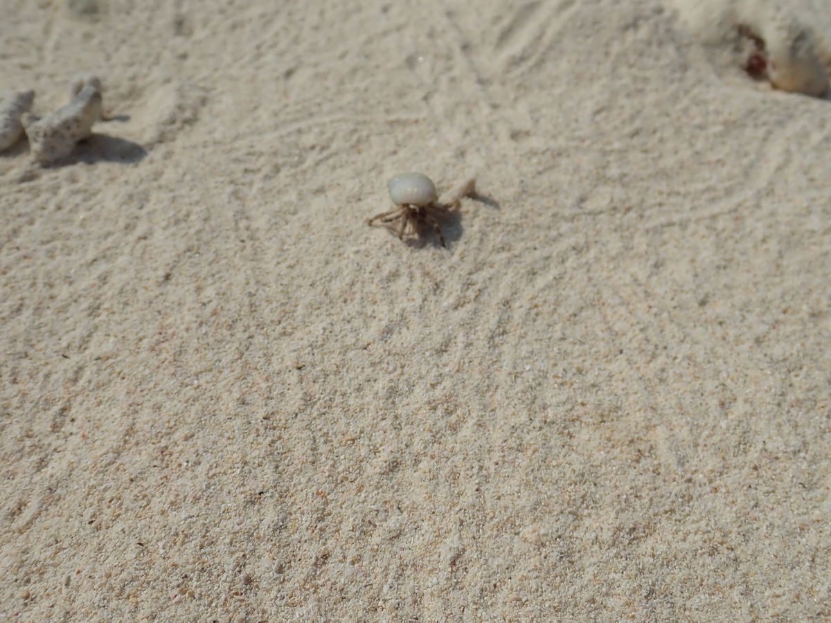 無人島では浜辺遊びやシュノーケリング。遠浅の海なので、陽の光が当たって海の中がとても綺麗に見えました。クマノミを見たりとても大きいヤガラを見たりしました。浜辺ではヤドカリがわんさかいたので観察したり手のひらに乗せたり。