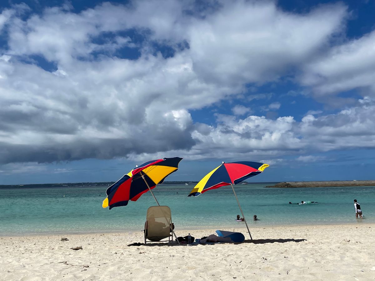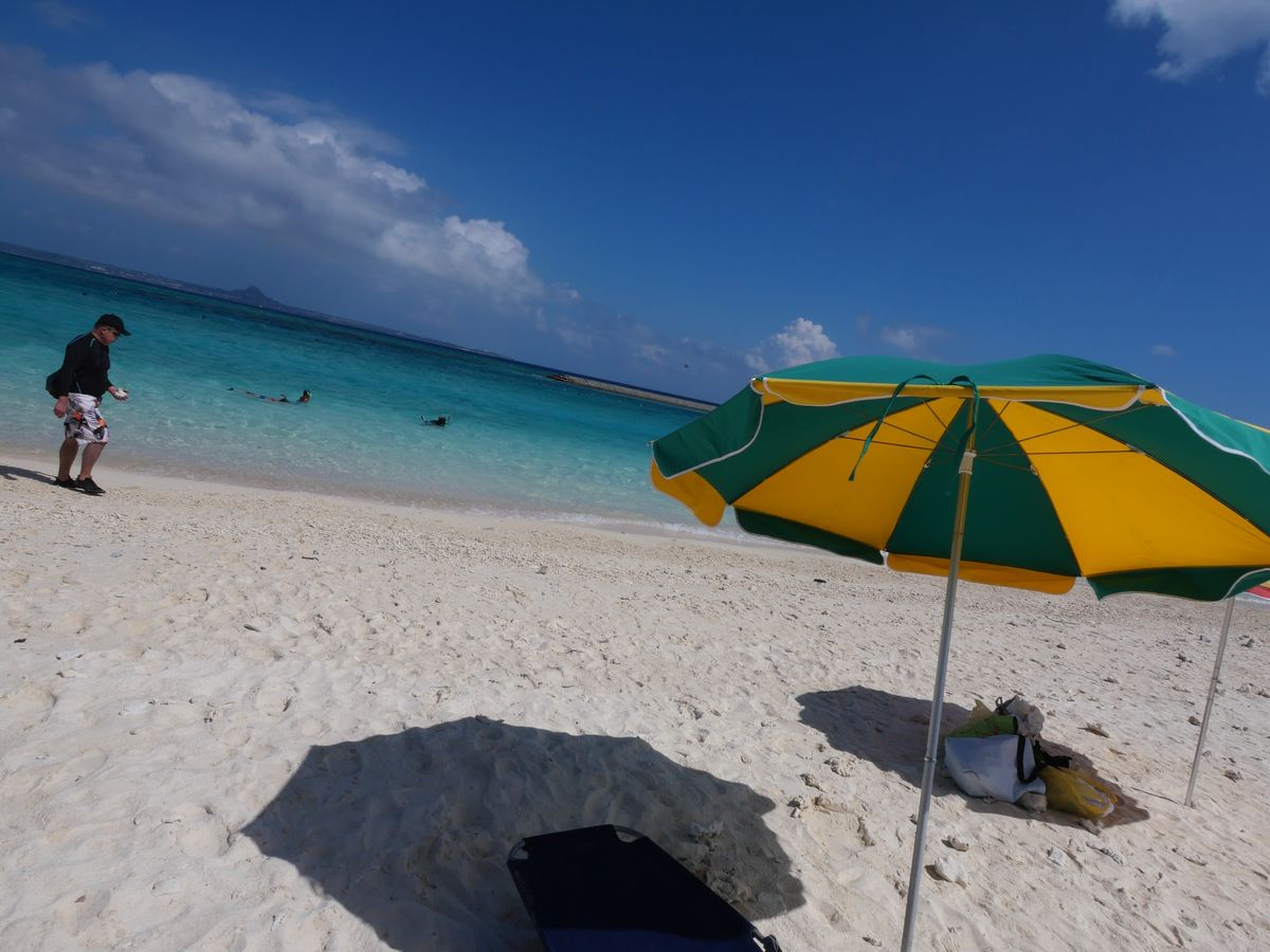 今回のプランでは1グループに1本パラソルが付いており、ビーチの好きな場所にスタッフの方が立ててくれます。待合所などに自動販売機がありますが、事前に用意した氷をたっぷり入れたクーラーボックスに好きな飲み物を本島から持ってきたので、常にキンキンに冷えた飲み物を飲みながらビーチでくつろぐことも出来ました。
