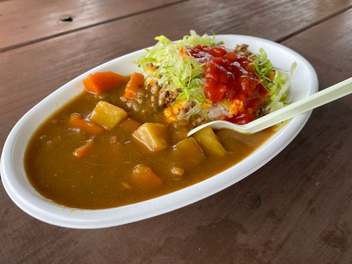 昼食は島のパーラーでいただくことができます。今回はタコライスカレーをいただきましたが、意外な組み合わせでおいしかったです!