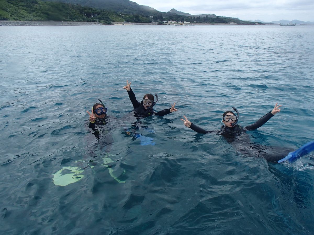 当日は天候のため、水納島には行けなかったのですが、近場のスポットでシュノーケリングを案内してもらいました。ボートに乗って、ポイントまで移動。5歳の息子はプールを習っているものの伏し浮きができるくらいだったので、初めてのシュノーケリングは心配でした。。実際やってみると、とても楽しそう!ビート板の大きなものにつかまり、インストラクターの方が見てくれていたので、うれしそうに魚たちを見ていました。私たち夫婦も、どちらか1人が子どもを見つつですが、安心してシュノーケリングをすることができました。全員大満足で、また機会があればぜひ体験したいです。1時間ほどで終了して解散となりました。