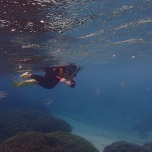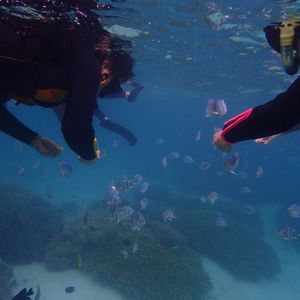 シュノーケルでは、先生が下さった麩を撒くとカラフルな魚たちがたくさん寄ってきます。
