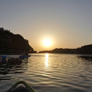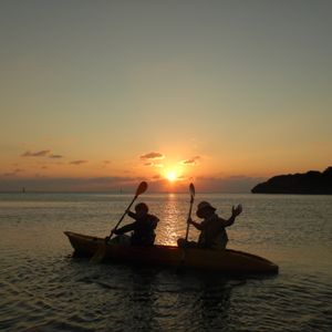 太陽が沈みかけた夕暮れ時の海へ、シーカヤックに乗って出発です。徐々に水平線へと落ちていく夕陽を眺めながら、ゆっくりと漕いで進みましょう。夕焼け色に染まった海面はなんともいえない美しさです。