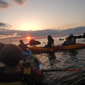 せっかくのサンセットカヤックの予定日が雨予報…。いちかばちかの私のワガママで、当日に変更のお願いに聞いて頂き、その日も曇り時々雨でしたが、夕方は、パァーっと晴れてくれて、キレイな夕日をバックに写真が取れ、少し寒かったけど、楽しかったです。