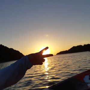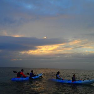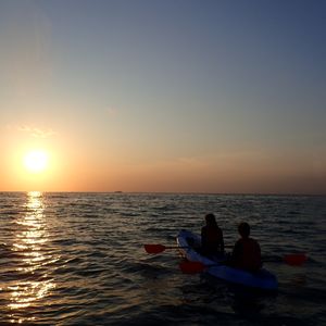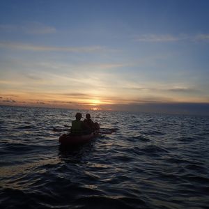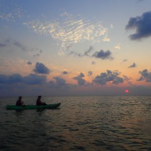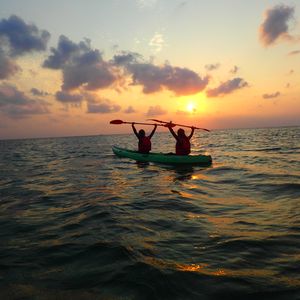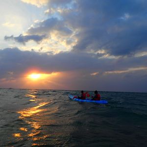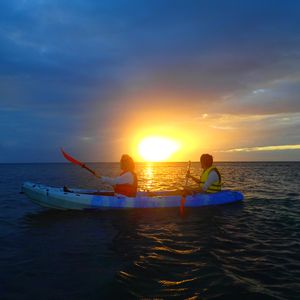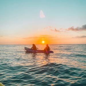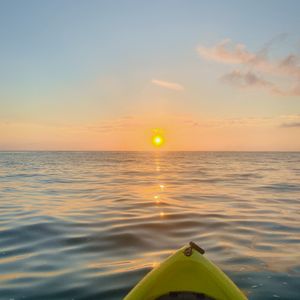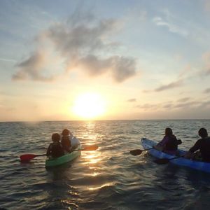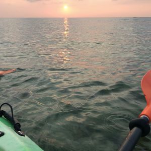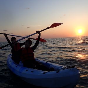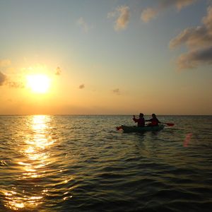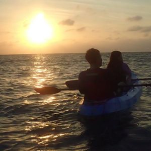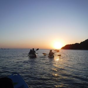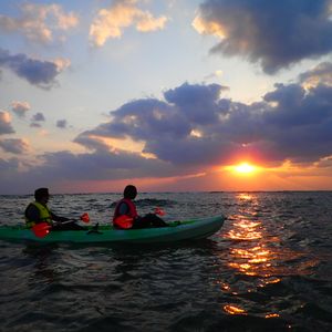 太陽が沈みかけた夕暮れ時の海へ、シーカヤックに乗って出発です。徐々に水平線へと落ちていく夕陽を眺めながら、ゆっくりと漕いで進みましょう。夕焼け色に染まった海面はなんともいえない美しさです。