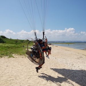 息子が体験しました。事前に電話連絡した際に「風の状態がよいので、早めに来てよい」とのこと。グーグルマップの位置情報を携帯に送ってもらって直接体験実施場所へ向かいました。初めての体験でしたが安心してお任せでできました。こちらの店舗は「白い砂のアクアトープ」というアニメに出ている場所だと教えて頂き、写真を撮らせてももらいました。息子はそのアニメを見ていたので、偶然のことに喜んでいました。ありがとうございました。