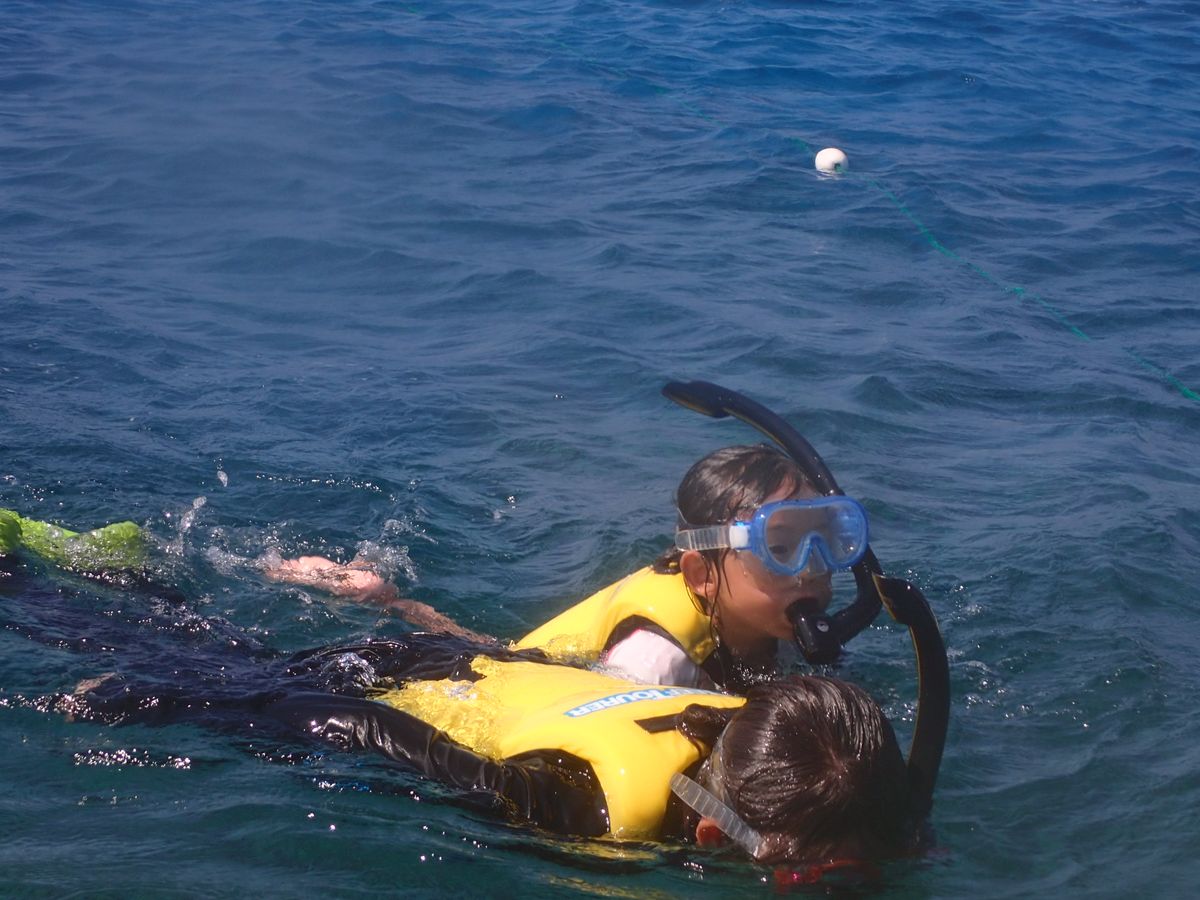 スノーケリング時は水着でもOKですが、ライフジャケットは皆さまご着用いただいてます。