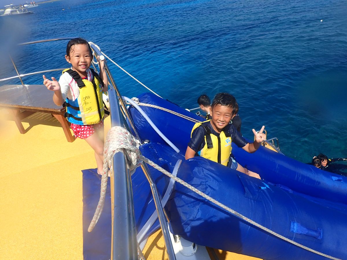 最初はシュノーケリング が目的もやっぱり船から海へ繋がる滑り台が子供達の楽しみでこのプランに。怖がると思っていた、1番下の娘は頭から海へスーパーマン。楽しすぎたみたいで永遠と滑り台で海へダイブしていました。その間に上の息子とシュノーケル。綺麗なサンゴ礁と魚に魅了され、最高の海を満喫。最後は家族4人でマーブル!綺麗な海で笑いが絶えず、右に左に上手く引っ張ってもらいました。スタッフの方もとても親切でこのプランにして本当に良かった。
