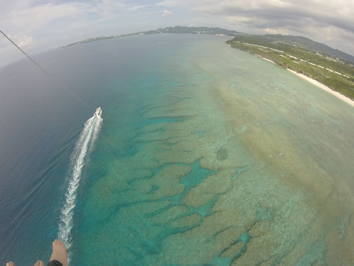 初めての時は一人で参加し、知らない方と一緒に飛んだので楽しかったかどうかよく覚えていません。今回は十何年ぶりのパラセーリング。息子と乗ることになりました。怖いもの知らずの息子は大はしゃぎ。でも私は・・・初めての時よりこわいなぁ・・・と思いながら・・・気が付けば、あっという間に空の上に到着。風で揺れることもなく、上では安定感が思った以上にありました。空から見る景色は・・・サンゴ礁の青い海で、本当に感動しました。高さが50m位だったので。。。