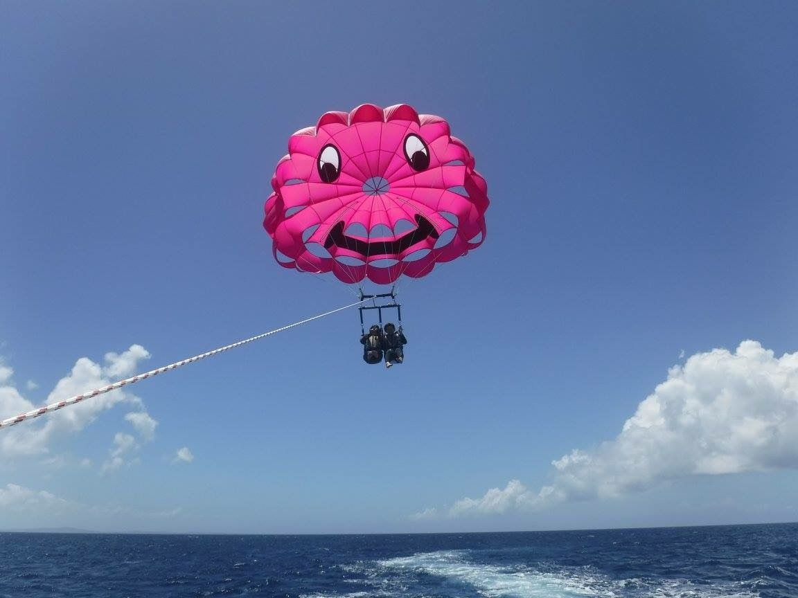 マリンスポーツをずっとしてみたいと思っていましたがなかなか機会がなく、今回家族旅行で沖縄に来たので初めてマリンスポーツをしました!マリンスポーツをする場所までは船で移動。その船も結構揺れるので1種のマリンスポーツな感じで楽しかったです。そして、小さな島に着いてからはマリンジェットとマーブル(バナナボートかマーブルか選ばせてくれました)をしました。マリンジェットもマーブルも私たちの様子を見ながらスピード調整してくれたのでとても楽しめました。ですが、オプションでもう1種追加していたはずなのに2種類しか乗れず…バウチャーにもオプション追加の記載がなかったし、私の勘違いかなと思い、事務所に帰ってから確認してみることにしました。そしてパラセーリングまで2時間ほど時間があったのでシュノーケリングや島散策をして帰りの時間まで楽しみました。(待っている間は飲み物代や遊ぶお金がかかるのでお金は持って行った方がいいです。)念願のパラセーリングは…怖さは全くなくとても気持ちがよかったです‼︎また沖縄に行ったら絶対にやりたいと思います。そして気になっていた追加オプションは、ベルトラの予約履歴にちゃんと載っていたので伝えたところ、残念ながらオプション代の半額しか返ってきませんでした。私もよく確認していなかったのが悪いですが、同じような間違いが今後起こらないように、バウチャーにも追加オプションの旨を記載し、またツアー会社でもよく確認していただきたいと思いました。