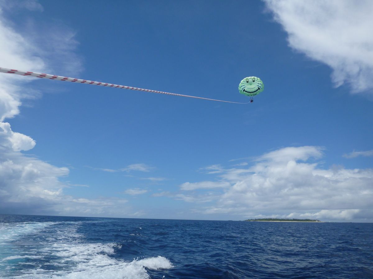 イメージでは港から出発して、ポイントでパラセーリングをすると思っていたのですが、実際はビーチからバナナボートに乗り、沖の船まで移動したあと、ポイントまで移動しました。パラセーリングも楽しみだったのですが、行きも帰りもバナナボートが楽しめて、1度で2度、3度おいしい体験でした。