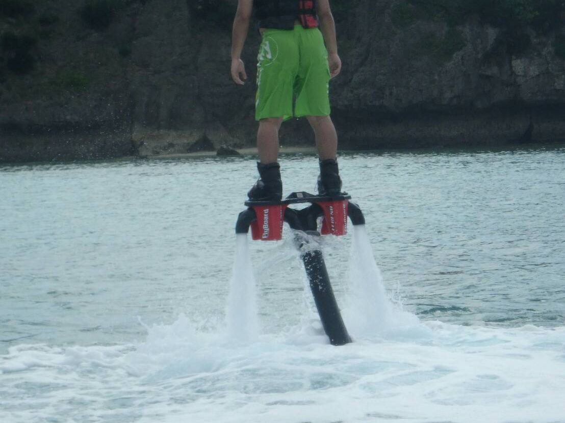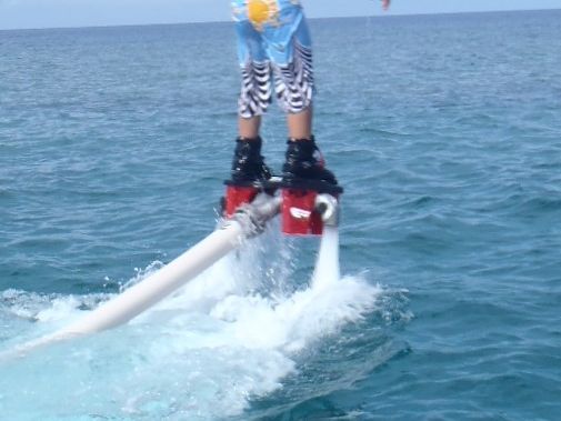 私は運動が苦手ではないのですが3回目ぐらいでやっと飛ぶことができました。1回出来てしまうとその後は簡単で前に進んだり回転することもできました。ただ初回の体験ということもあり1メートルくらいしか上に飛べなかったのが残念です。ただ、海の上を自身が飛んでいるといういまだかつて体験したことない貴重な体験ができ、満足しています。次回の挑戦でもっと高く飛びたいと思いました。ジェットスキーで待っているときには声をかけてくれたり魚がいたら教えてくれたり待っている間も楽しい時間を過ごすことができました。体験の時に係りの方がたくさん写真を撮ってくれるのでよい思い出になりました。 どうもありがとうございました。