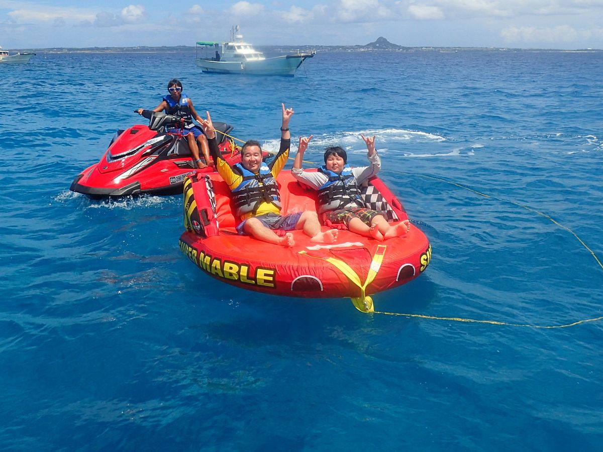 パラセーリングが終わるとそのまま水納島という離島に行きました。ビーチには白い貝殻、海は透き通ったきれいな水色で最高のコントラストでした。 海で泳いでいると熱帯魚のような色鮮やかな魚や、大きい魚が群れで泳いでいるのを肉眼で水面から観察することができました。自由時間の後はジェットスキーとマーブルを楽しみました。マーブルは水面に振り落とされるか落とされないかぐらいの絶妙さがとてもエキサイティングでした。ジェットスキー体験ではサンゴや魚の紹介もしてくれました。