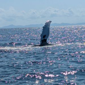 当日は天候も良く、波も穏やかな中でホエールウオッチングを体験できました。出港してしばらくした後、子クジラ1頭と大人のクジラ2頭が波間に浮かんでいるのが見えました。ちょっと遠かったですが、はっきりとクジラのいることが分かり感動です。その後もクジラは潜ったりまた浮かんだりを繰り返し、それをゆっくりと追いかけてみることができました。