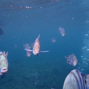 海の中は想像以上に綺麗!魚は逃げないむしろ寄ってくる!入水してからは妻はシュノーケルが口呼吸しかできないため慣れなくて手こずってました。