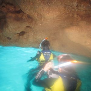 5~10分程度で洞窟の前に到着し、いくつかのグループに別れて担当の方の指示で海の中に飛び込みました。シュノーケルはしたことありましたが、深いところだと不安だったので、担当の方の浮き輪につかまって洞窟まで向かいました。参加した日は人が多かったのか、何度も人にぶつかりながら洞窟まで行き、洞窟の中もかなり人がいっぱいいる状態でした。それでも洞窟の中は想像通りの青色で、感動しました!!写真も何枚か撮っていただけて良かったです。