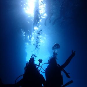 中2の息子と初めてのダイビングにチャレンジしました。お迎えからお店まで、いろいろと沖縄の話をしていただき、リラックスして参加できました。ダイビングの説明では、息子に語りかけるように、丁寧に説明していただき、緊張気味の息子もすこしずつ緊張が解けてきました。今回は、あいにく風がつよく船では青の洞窟に行けないとのこと。別のスポットに行っていただきました。さあ、ダイビングで、まずは息子から海へ入り、息をする練習。すぐにできました。次に私の番。水中では息を止めるのが常識で息を吐くということになれず、てこずりました。なんとか息ができるようになり、潜り始めたら耳がキーん。ちょうどそのときに耳抜きの合図をして頂きよかったのです。必ずするように!と言われていた耳抜きを忘れてしまうくらい、海がきれいで透明。魚がいっぱい。どんどん潜り、岩場に来たとき、目の前には生きているタコが足を広げて熱帯魚を追い払っていました。なかなか昼間は見れないタコまで見れて、えさをあげたら魚が目の前で入れ食い。サイコーの時間をすごせました。船にあがると案外体が冷えていましたが、お湯をかけていただきホッコリ。帰りの車では息子はぐっすりでした。わたしは当日夜までは耳が痛かった。耳抜きを忘れるくらいに綺麗な海を、妻と娘に話し、次は、家族全員で青の洞窟に行ってみたい、となりました。ありがとうございました。