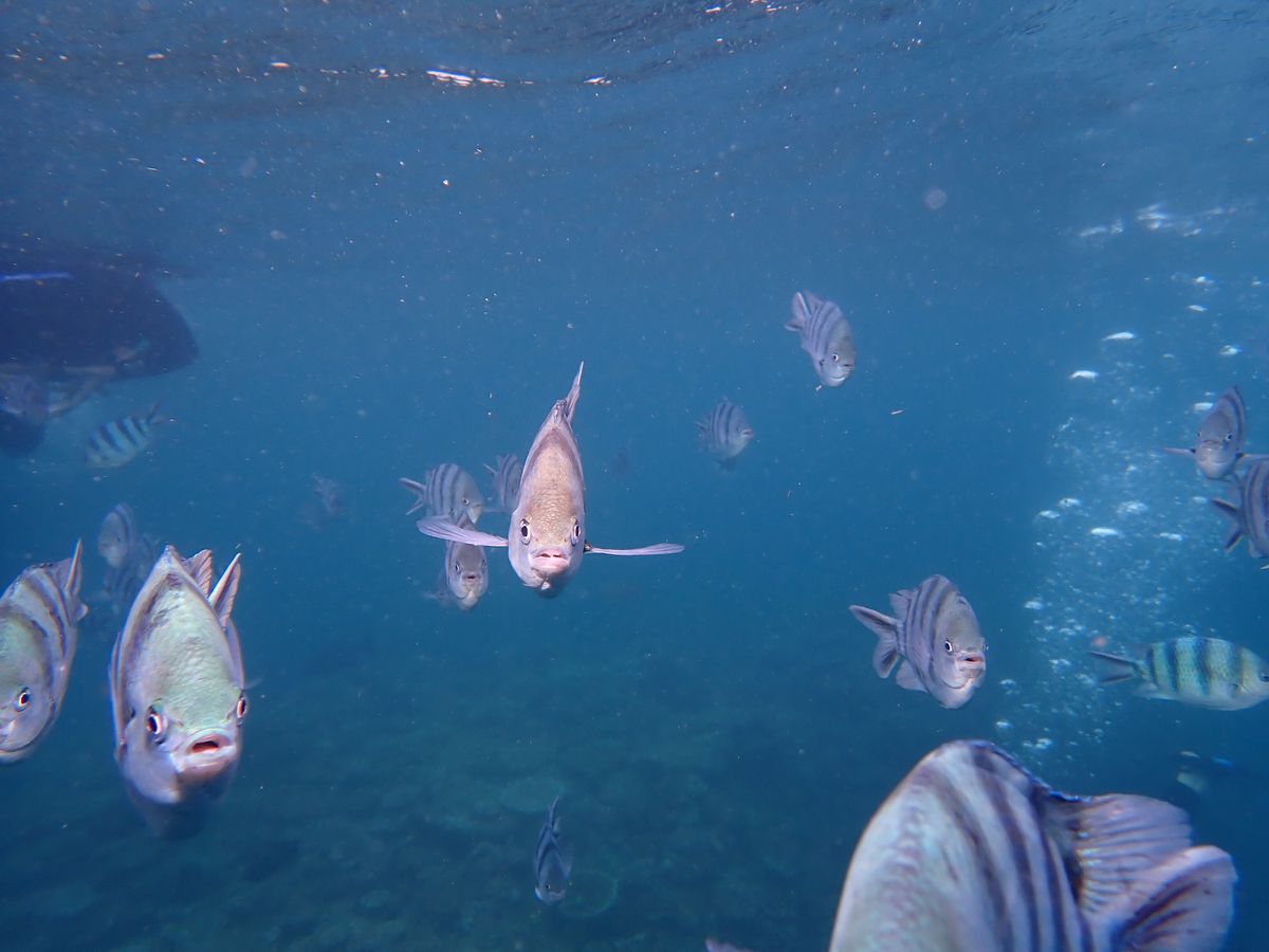 海の中は想像以上に綺麗!魚は逃げないむしろ寄ってくる!入水してからは妻はシュノーケルが口呼吸しかできないため慣れなくて手こずってました。