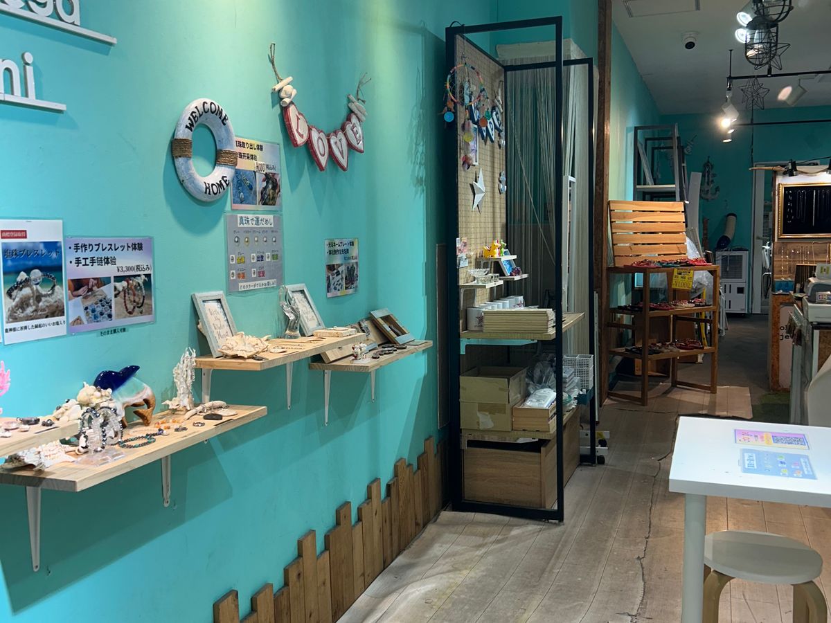 旭橋の先から歩いていって45分かかりました。牧志の駅から歩けば近いと思います。アーケードの商店街のような所にありました。店に着いたあと、お手洗いに行きたくなりましたが、店内にはなく近隣の階段を登った施設に借りにいきました(徒歩数分)。貝から真珠を取り出す作業は、自分の奥さんは割と早く出来ましたが、自分は時間がかかっても出来ず、相方にやってもらいました。その真珠でネックレスが作れたのは良かったです。