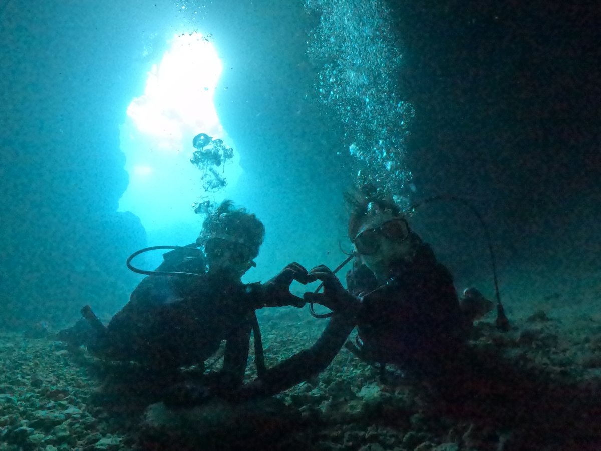 まずはダイビング、お互い初めてで楽しみ半分不安半分で臨みましたが、インストラクターの方の丁寧で優しい声掛けによりスムーズに潜ることができました!青の洞窟の神秘的な世界や餌付け体験での魚達の集まりを見たらものすごく感動しました!