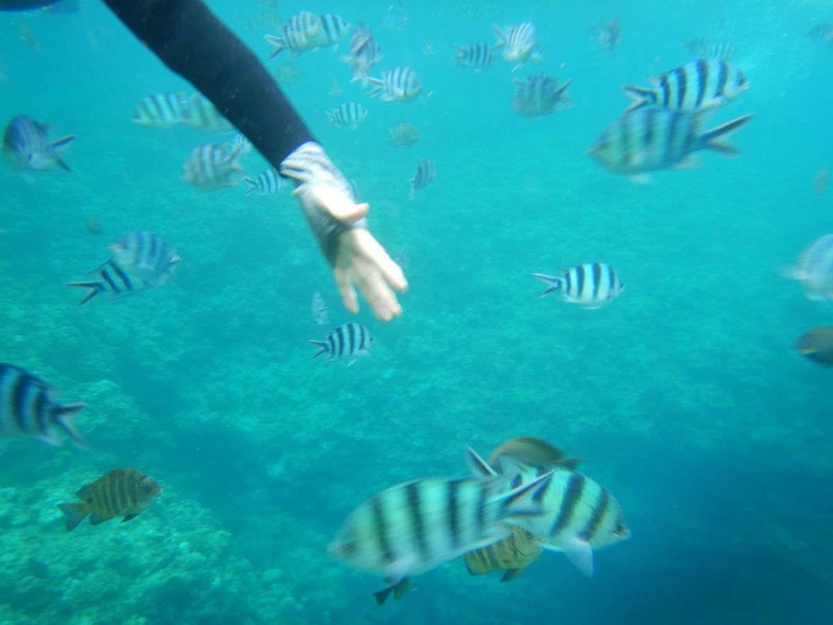 曇りでしたがそれでも海は綺麗で、餌やりに魚は思った以上に集まってくれて興奮します。