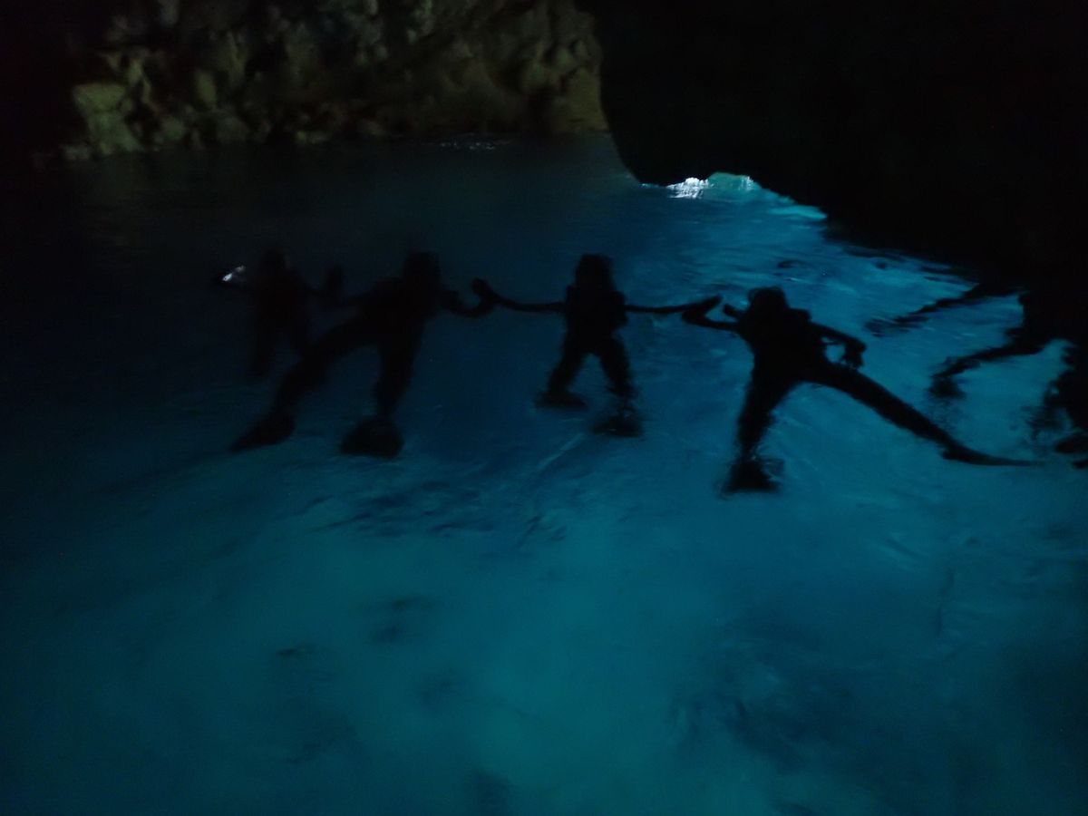 2回目は青の洞窟へのダイビングです。ここではインストラクターの方に着いて行く形で、青の洞窟を目指して進んでいきます。洞窟に近づくと光が少なくなり暗くなるので、インストラクターのライフジャケットに掴まりながら進みます。暗い中を進み、入口の方面を振り返ると、とても綺麗な青色の景色が広がっていました!これはかなり感動です。朝早かったこともあり、人が少なくとても綺麗に見えました!インストラクターの方々も朝イチがおすすめとのことでした。