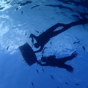 着替えた後崖下の階段を歩いて下り、すぐ下に続く岩場から海に入っていきます。インストラクションのあと、早速洞窟に向かってシュノーケリング開始!海中では魚以外にダイビングをしている人達も見えます。