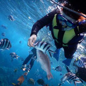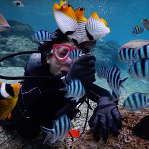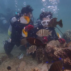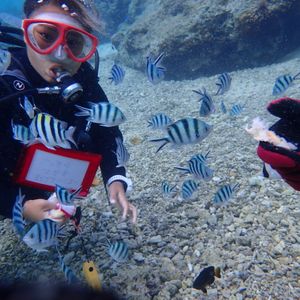二人ともスキューバは初めてでしたが、スタッフのなおちゃんが丁寧にわかりやすく説明してくれて、普段は眼鏡の私達ですが度付きのゴーグルを貸し出してくれて、それが驚くほど見える!!水の中は暖かく感じて、浅瀬の所でも魚がチラホラ。奥まで潜ると、そこは一面ニモの世界!(笑)餌やりも顔が見えなくなるほどの魚達が目の前に近付いて来てくれて、なおちゃんが魚の種類とかも教えてくれて、なによりも水中マジックとバブルリングで楽しませてくれました!相方は泳げないし水も苦手だったのですが、サポートしてくれたおかげで何の不安もなく、『本当に経験して良かった!』と帰ってきてからもずっと言っています(笑)