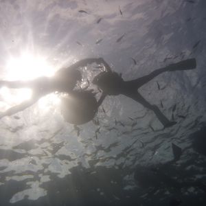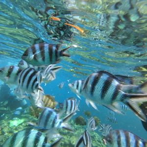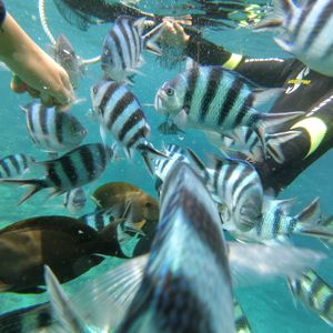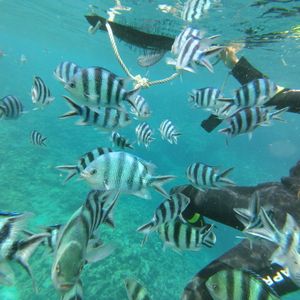 想像していたよりもずっと海がきれいで透き通っていて、魚もたくさん泳いでました。魚は人に慣れているようで、泳いでいるだけで寄ってくる魚もいました。