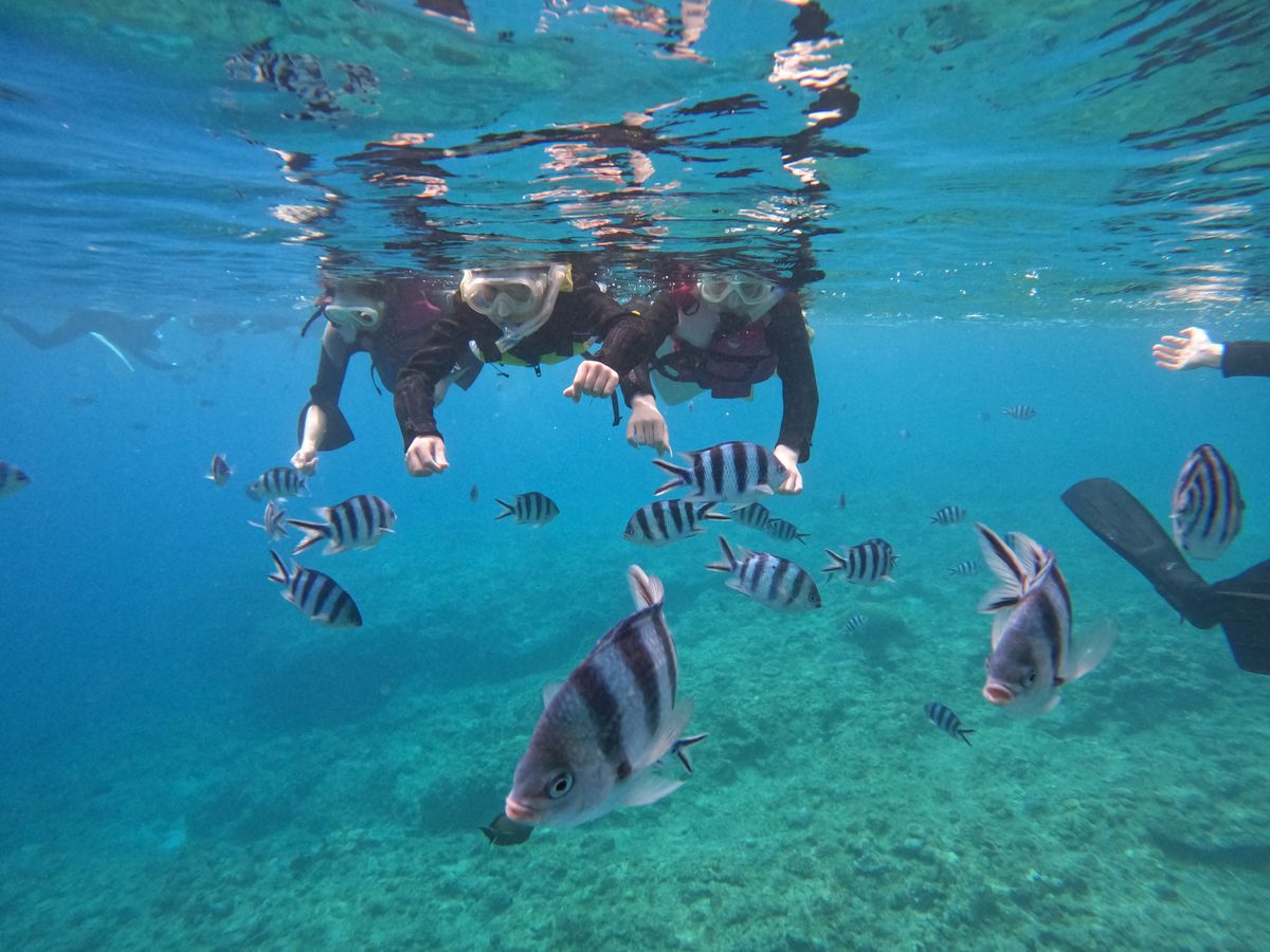 泳ぎが得意な主人と娘(成人)、水恐怖症の私、3人で参加しました。インストラクターが2名付いてくださいました。まずは陸の上での説明があります。すでに緊張しているわたくしでしたが説明を面白おかしく・詳しく説明してくださり、緊張がほぐれました。海についてからは、主人と娘はやる気満々でしたが、わたしは怖くてたまりませんでした。ですが、インストラクターのかたがマンツーマンでついてくださり、「安心して下さいね。全部お任せください^_^」と優しいひと言で本当に心が落ち着きました。息継ぎが上手くできずパニックになり、ずっと強い力でしがみついていたと思います。嫌な顔ひとすせず、ずっと励ましてくださったおかげでたくさんの大きな魚をみることができました。大きな魚を見られた時は感動しました。本当にありがとうございました。途中で諦めなくてよかったと思いました。施設にいらしたスタッフのかたもとても感じがよいです。笑顔が素敵でした。アメニティも充実しています。海が大好きなかたはもちろんですが、水恐怖症で泳ぎが苦手なかたにも断然おすすめのツアーです!
