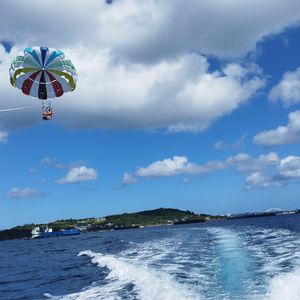 先日はありがとうございました。60代と70歳の2人で参加しました。70歳で参加できたのはこちらだけだったので、本当に貴重な体験をさせていただきました。楽しみ半分、怖さ半分での参加でしたが、怖さはほとんどなく、楽しむことができました。船に乗っているところ、飛ぶところ、上空にいる所を写真に撮って送ってもらい、思い出として残せて良かったです。送迎を待つ間も、椅子など貸していただき、ゆっくり待つことができ、高齢者としては大変助かりました。沖縄へ遊びに行った時には、また参加させていただきたいと思います。優しく大変親切な皆様で、大変良い思い出ができました。ありがとうございました。