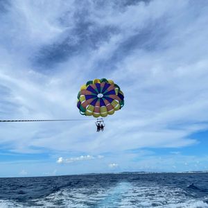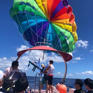 パラセーリングの体験は初めてで楽しめるかどうか不安だったのですが、とても楽しく一生の思い出になるような素敵な時間を過ごすことが出来ました。体験前雨も降り出し、風も強くなり、スタッフさんも「少し厳しいかもしれません…。船に乗るだけになるかも…」とおっしゃるくらいの天気でしたが、なんとか出航。参加者全員パラセーリングを体験することができました。船の急ぎ具合とスタッフさん達の雰囲気から、相当ギリギリを攻めていることは伝わりました。港に戻るとすぐ大荒れの天気に。パラセーリングを体験させてあげたいと頑張ってくださったスタッフさんには感謝しかありません。行き帰りの船は海が荒れていたため激し目の揺れでしたが、アトラクションみたいでそれも楽しかったです笑。私も酔いやすい方ではありますが、酔い止めを服用していたためか酔うことはなかったです。心に残る素晴らしい時間を過ごせました。ありがとうございます。